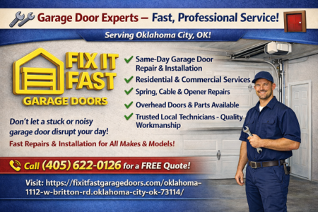 Looking for reliable garage door solutions in Oklahoma City, OK? Fix It Fast Garage Door Parts has you covered! βœ” Same-Day Garage Door Repair & Installation βœ” Residential & Commercial Services βœ” Spring, Cable & Opener Repairs βœ” Overhead Door Installation & Parts Available βœ” Trusted Local Technicians – Quality Workmanship Don’t let a stuck or noisy garage door disrupt your day! From quick fixes to full replacements, we handle all makes and models with fast response and excellent service. πŸ“ž Call (405) 266-0888 for a free quote