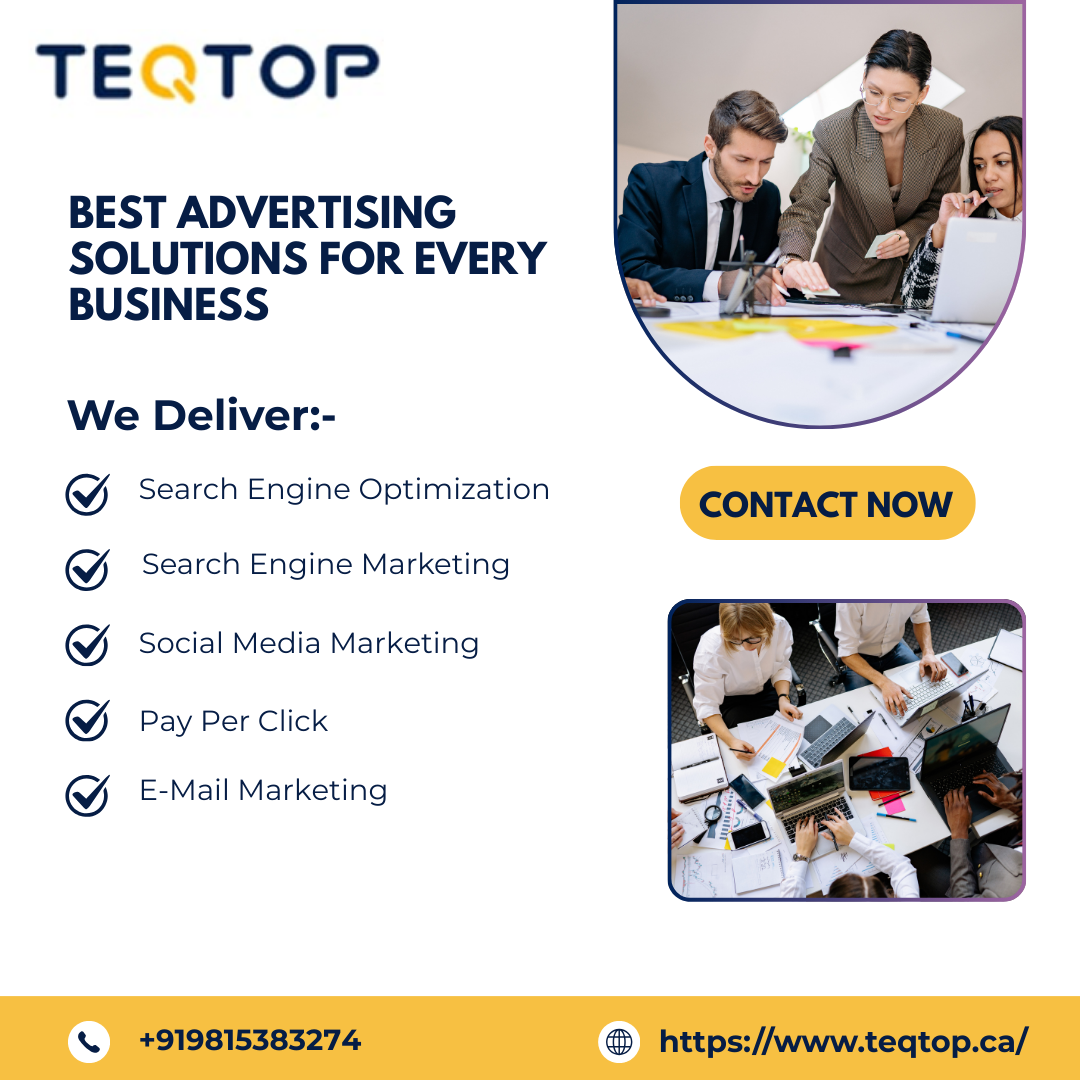 Teqtop Canada provides complete digital marketing solutions to help your business grow online. From SEO, PPC, SEM, and Social Media Marketing to Email Marketing, our expert strategies drive traffic, boost engagement, and increase conversions. Our team creates customized campaigns tailored to your business goals, ensuring maximum ROI. With data-driven insights, we help your brand stay ahead of the competition, build a stronger online presence, and achieve sustainable growth. Partner with Teqtop Canada to turn clicks into loyal customers and transform your digital potential into real results.