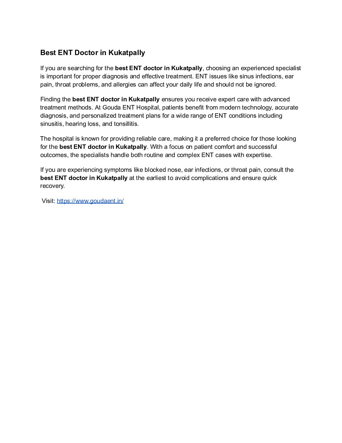 Finding the best ENT doctor in Kukatpally is essential when dealing with issues related to the ear, nose, and throat. These problems may seem minor at first but can lead to serious complications if left untreated. From sinus infections and allergies to throat pain and hearing issues, proper diagnosis and timely treatment are crucial. At Gouda ENT Hospital, patients receive specialized ENT care supported by modern technology and experienced medical professionals. The hospital is known for delivering effective treatment with a patient-centric approach.