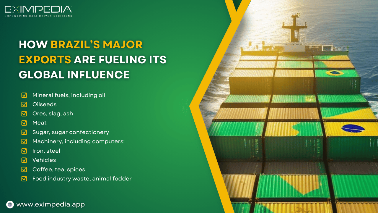 Explore insights on Brazil’s major exports including oil, soybeans, iron ore, meat, and sugar, along with key trade partners and export data. Understand how Brazil’s major exports drive global trade and economic influence with actionable insights from Eximpedia.App