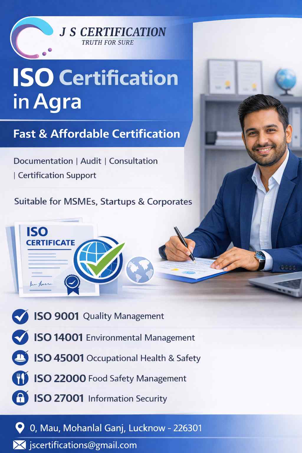 ISO Certification in Agra helps businesses establish effective management systems based on internationally recognized standards. Organizations adopt ISO standards to improve quality control, operational efficiency, and customer satisfaction. Implementing standards such as ISO 9001 for quality management, ISO 14001 for environmental management, and ISO 45001 for occupational health and safety helps companies build reliable and structured business processes. Professional ISO consultants in Agra assist organizations throughout the certification journey, including gap analysis, documentation preparation, system implementation, employee awareness training, and internal audit support. With proper guidance, businesses can successfully meet ISO requirements and prepare for the final certification audit. ISO Certification also enhances a company’s credibility in the market and demonstrates its commitment to quality, safety, and continuous improvement. Many organizations pursue ISO certification to increase customer trust, qualify for government and private tenders, and expand business opportunities. By adopting ISO standards, companies in Agra can strengthen their reputation, improve operational performance, and compete effectively in both local and global markets. Visit for more Information:- Call us:- 7905612820 Email:- jscertifications@gmail.com Address:- 0,Mau, Mohanlal ganj Lucknow -226301