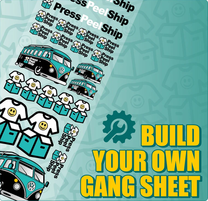 The Press Peel Ship DTF gang sheet builder lets you upload, scale, and arrange multiple designs in one layout without needing design software. Mix logos, full fronts, and sleeve hits on a single sheet. No minimums, same-day production on qualifying orders, and professional-grade results on cotton, polyester, nylon, canvas, and more.