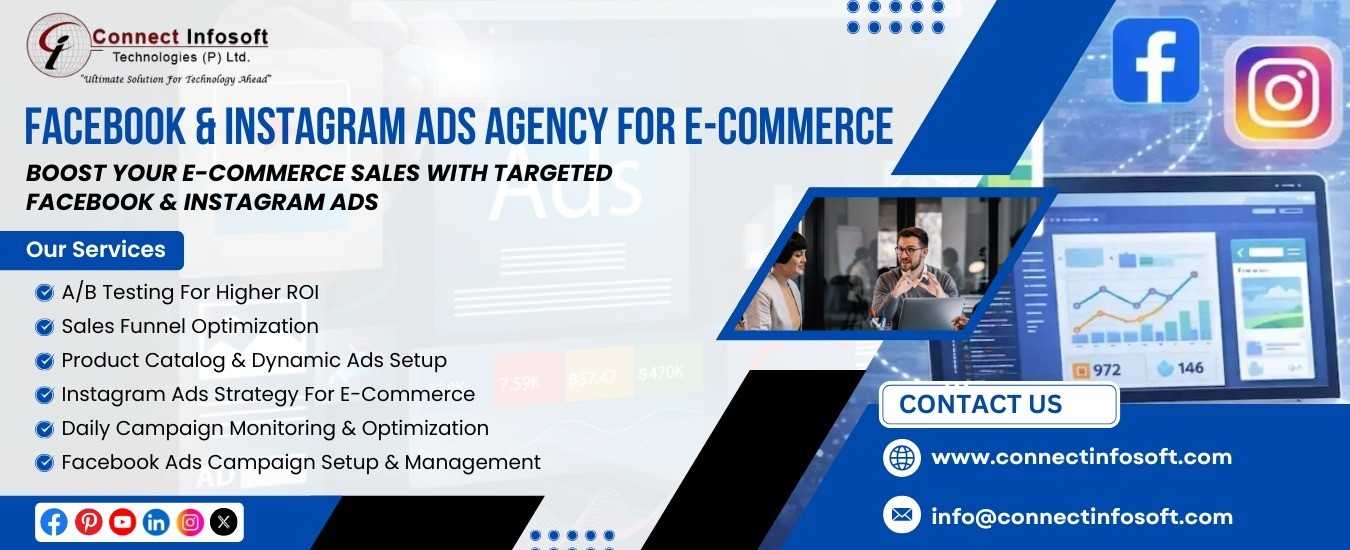 Connect Infosoft is a trusted ads agency helping eCommerce brands grow with targeted campaigns on Facebook and Instagram. We create high-converting ad strategies, product-focused creatives, and performance-driven campaigns to increase traffic, leads, and online sales for your eCommerce store.