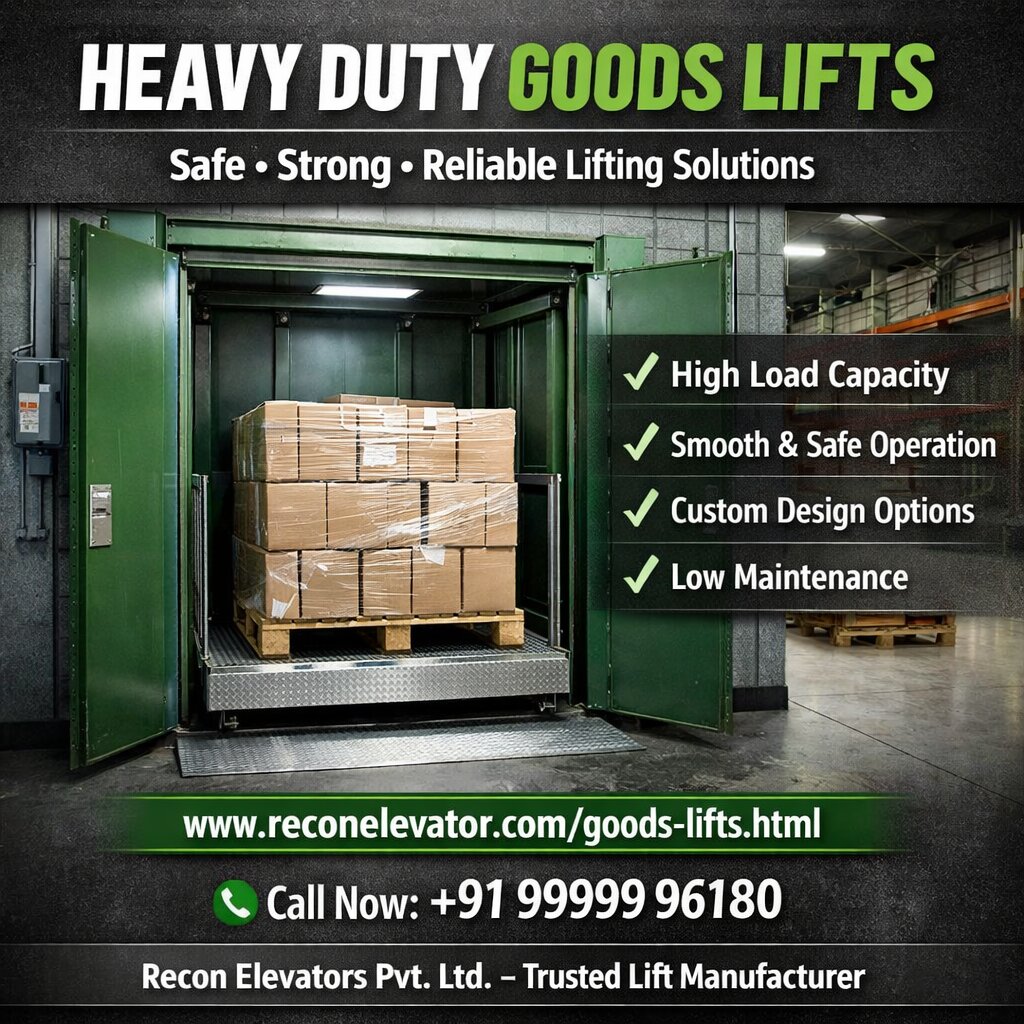 Recon Elevators Pvt. Ltd. is a well-known company in Delhi that specializes in manufacturing goods lifts. Goods lifts are important for businesses because they help move heavy items between different floors of a building. For example, in a warehouse or a factory, using a goods lift can make it easier to transport products without needing to carry them up and down stairs. This not only saves time but also keeps workers safe by reducing the risk of injury from lifting heavy loads. One of the key features of goods lifts made by Recon Elevators is their strong design. These lifts are built to handle heavy weights, which makes them perfect for industries like retail, manufacturing, and logistics. Recon Elevators ensures that their goods lifts are reliable and durable, so businesses can count on them to work well over time. They also focus on making their lifts easy to use, so anyone can operate them without difficulty. In addition to making high-quality goods lifts, Recon Elevators also provides excellent customer service. They help customers choose the right type of lift for their needs and offer support for installation and maintenance. This means that businesses in Delhi can get the help they need to keep their goods lifts running smoothly. Overall, Recon Elevators Pvt. Ltd. is a trusted choice for anyone looking for efficient and safe goods lifts in the city.