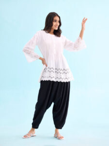 Styling harem pants for women is all about balance and creativity. Their relaxed and flowy design makes them versatile, but the real magic happens when you accessorize them right. Pair them with crop tops or fitted blouses to balance the silhouette, and add a bold belt to define your waistline. Jewelry like long necklaces or chunky earrings can instantly elevate your look, while crossbody bags or chic clutches complete the outfit. For footwear, strappy sandals or block heels are perfect to enhance the vibe. With the right mix of accessories, harem pants can take you from a casual brunch to an elegant evening effortlessly.