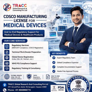 The CDSCO manufacturing license for medical devices is a crucial regulatory requirement in India for companies involved in device production. It ensures adherence to Medical Device Rules, quality management standards, and safety guidelines. Manufacturers must submit proper documentation, maintain compliant facilities, and follow regulatory processes. This license helps build trust, ensures product quality, and enables smooth entry into domestic and international markets. Visit our website for more Information:- Call us:- +918868886774 Address:- TRACC Global Research And Consulting Pvt Ltd, 1271, Ground Floor, Sector-45, Gurugram, Haryana-122001.