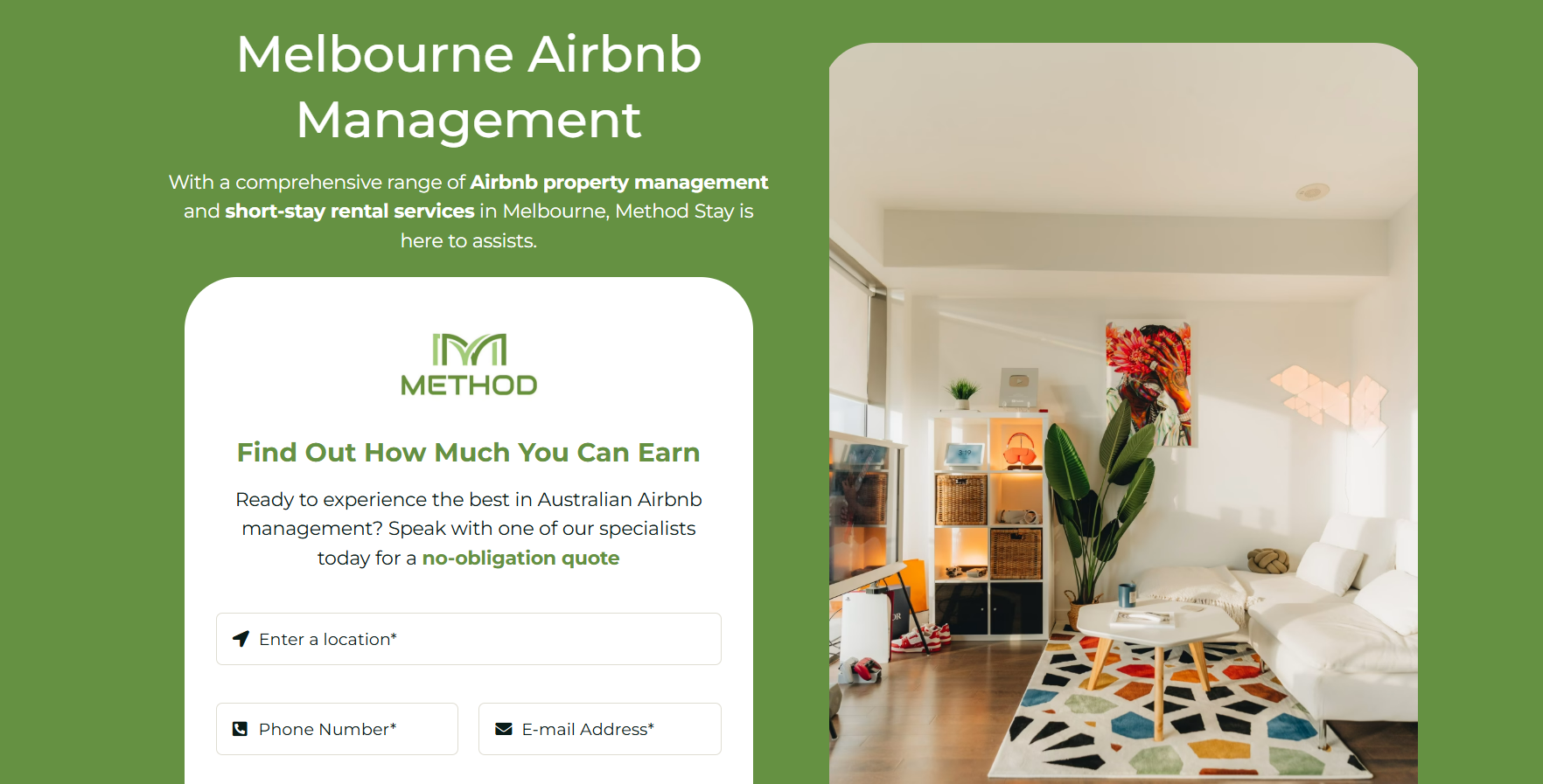 Method Stay is a comprehensive short term rental service provider for Melbourne’s most sought-after suburbs with a team of certified property managers. Whether it’s a stylish apartment in Southbank, a family home in Burwood, or a beachside escape in St Kilda, our tailored services ensure maximum occupancy and premium guest experiences. With deep local knowledge and proven results, we help property owners attract the right guests and grow their rental income across Greater Melbourne.