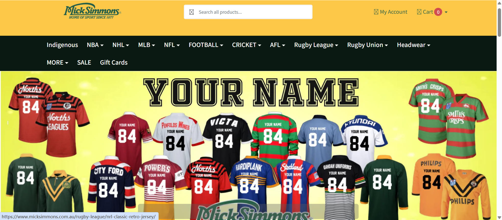 Established in 1877, Mick Simmons Sport is Australia’s oldest continuously operating specialty sports store. Located in Sydney CBD, we stock a wide range of licensed apparel across major local and international sports, including Soccer, AFL, NRL, NFL, MLB, Cricket, Basketball, NHL, F1 and V8 Racing. We also offer sporting equipment, fan-wear and fashion from leading global brands, with popular products available online and an even larger selection in store.