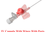 An IV cannula is a thin and flexible tube that can be inserted by a nurse or a doctor inside a vein to gain access directly into the bloodstream. This provides a way to inject medicines or fluids directly into the veins without using needles again and again. There are soft wings attached to hold the cannula in place, along with a port for injecting medicines.