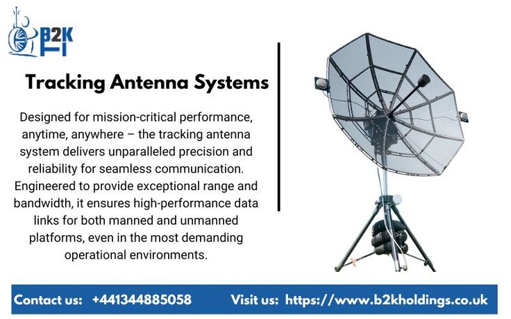 Tracking Antenna Systems from B2K Holdings are engineered for secure, stable, and long-range defence communications. Designed to support ISR, airborne surveillance, and tactical operations, these systems ensure accurate signal tracking, reliable data transmission, and robust performance in harsh operational conditions across military and security applications.